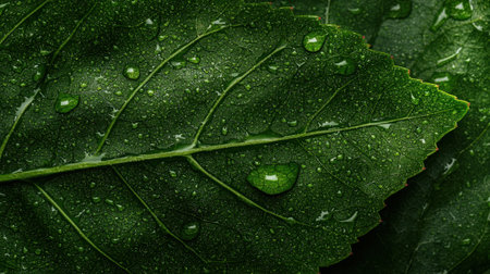 A closeup image of a fresh green leaf adorned with glistening water droplets, illuminated by soft natural light, showcasing the intricate details and vibrant colors of nature.