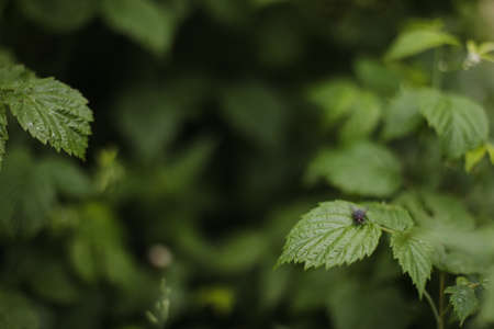 Raspberry leaves close up. Raspberries in summer in the garden without berries