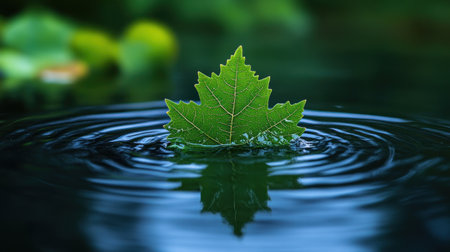 A vibrant green leaf gently floats on a serene water surface, creating subtle ripples that reflect its delicate form. The tranquil scene evokes a sense of peace and natural beauty.