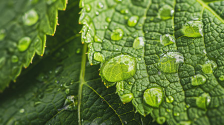 Sparkling water droplets cling to the vibrant green leaves of a plant, creating a refreshing scene of natural beauty after a rainfall, capturing the essence of a thriving ecosystem