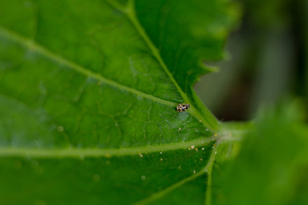 The small bug perched on green leaves in the garden.