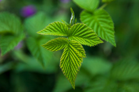 Young juicy raspberry leaves in the garden. Close-up from above