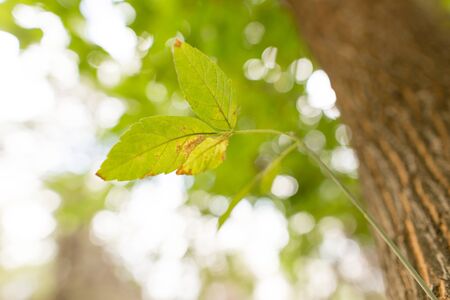 Green leaves background in sunlight with bokeh. Beautiful nature scene.