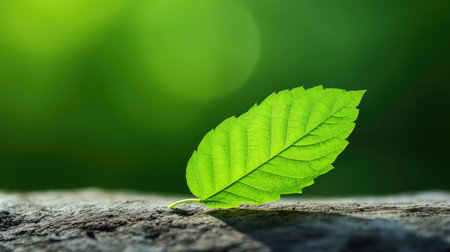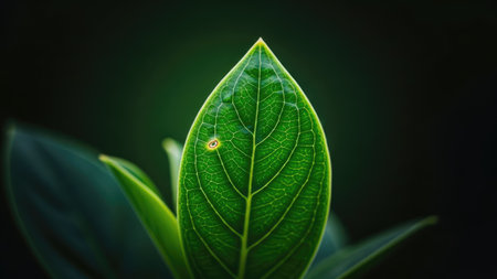 A detailed image showcases a single, healthy green leaf with visible veins, set against a soft, dark backdrop. The composition is close-up, highlighting texture and detail. The overall impression is one of natural beauty. Suitable for commercial or editorial applications focusing on nature and botanical subjects.