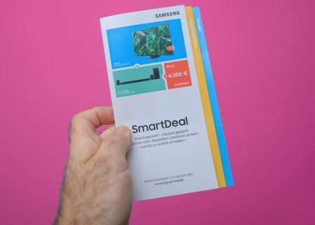 Paris, France - Dec 24, 2023: A male hand holding a Samsung Smart Deal flyer advertising a special cashback offer of up to 4000 euros for Samsung TVs and soundbars, highlighting attractive deals