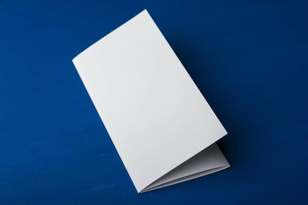Blank tri fold brochure on blue background to replace your design or message. A mock-up for brand identification for designers