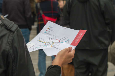 Copenhagen, Zealand Denmark - 29 9 2019: Woman holding map of new M3, M4 Cityringen metro. New metro line opening day