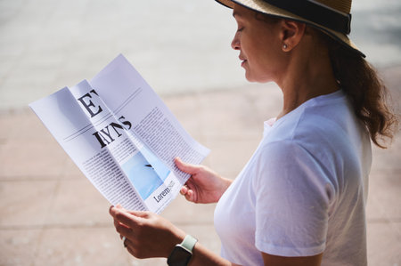 A woman wearing a hat and casual attire is outdoors, engrossed in reading a folded newspaper. The scene suggests leisure, relaxation, and staying informed.