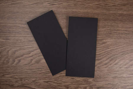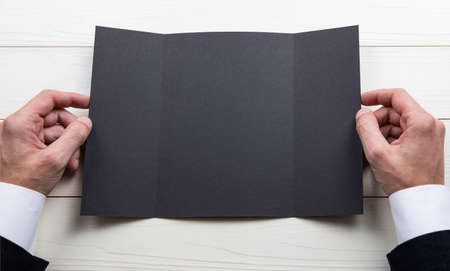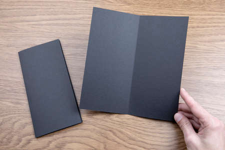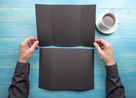 Mens hand holding empty black flyers on blue wooden background. Blank paper mock-up