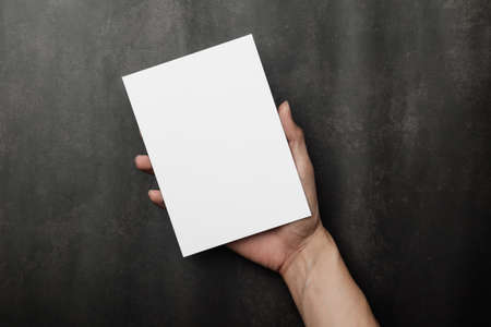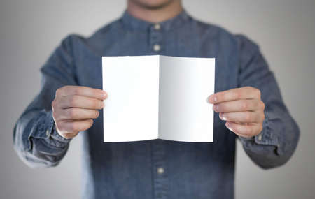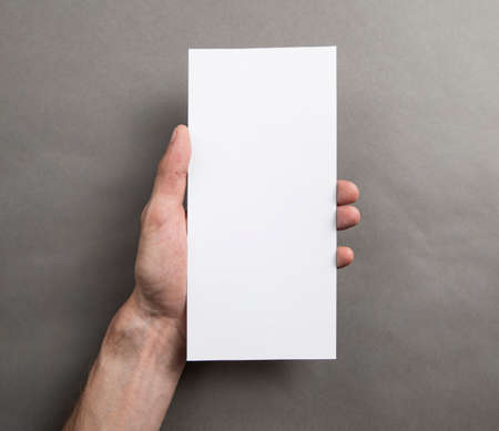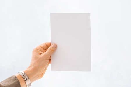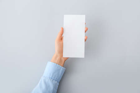 Mens hand holding empty white flyer on light gray background. Blank paper mock-up