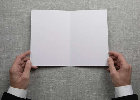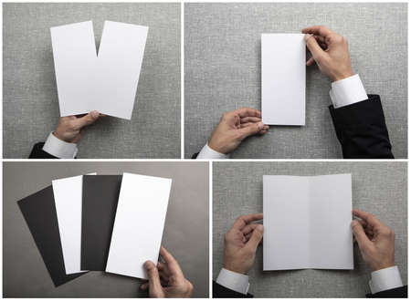 Mens hands holding empty white flyers on gray background. Blank paper mock-up