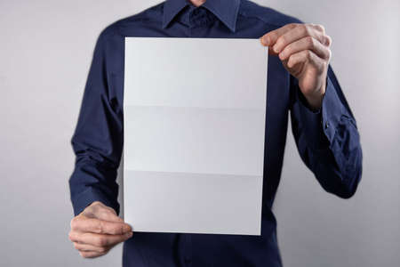 A man holds a white piece of paper. A flyer in the hands of a man. Prepared for your text. Isolated on a gray background.