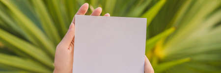 Womens hands in a tropical background holding a signboard paper, mockup BANNER, LONG FORMAT