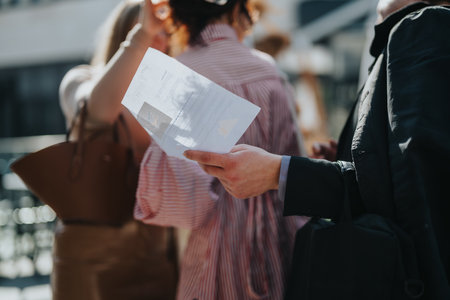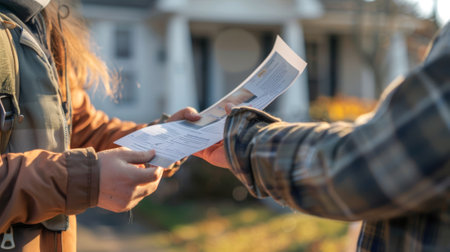 Volunteer handing out a political flyer to a person outdoors. Close-up of flyer exchange. Concept of elections, political campaign, grassroots movement, voter engagement, and democracy.