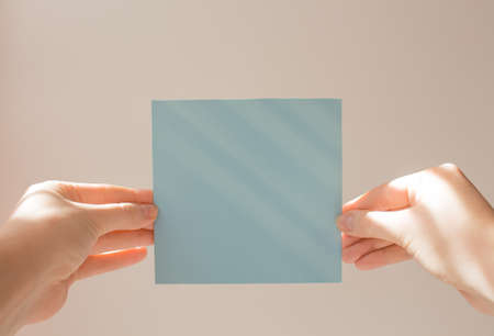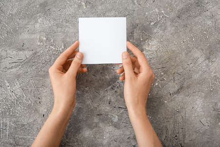 Holding empty paper in the hands, gray colored background, copy space for text, blank card