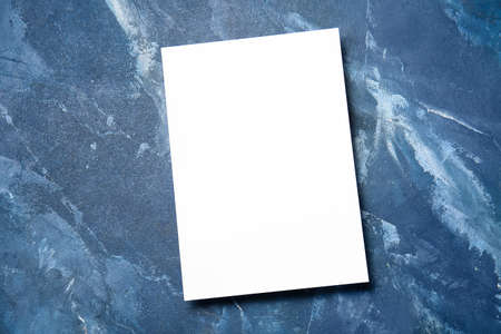 Mens hands holding empty white flyer on blue wooden background. Blank paper mock-up