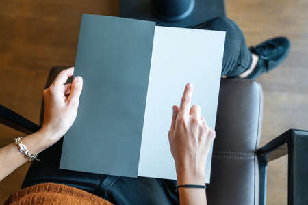 woman is holding and pointing on an empty page as template texture, card, menu or brochure . High quality photo