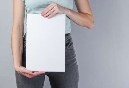 Woman holding white empty sheet of paper for copy space on gray background. Crop photo, studio shot