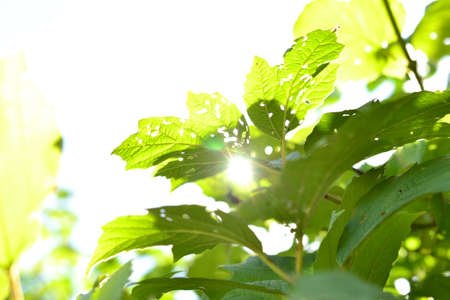 Green leaves background in sunlight with bokeh. Beautiful nature scene.