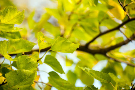 Leaves, which begin to turn yellow, on the branches of a tree. The beginning of autumn