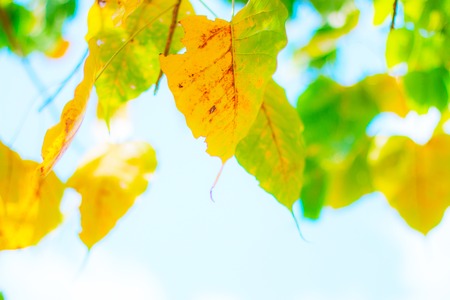 Autumn season background with bright leaves colored from green to yellow. Gradient colors of the fall foliage.