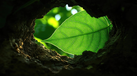 A stunning close-up view of a vibrant green leaf illuminated by sunlight, framed by a circular opening in a tree trunk, showcasing the beauty of nature's design.