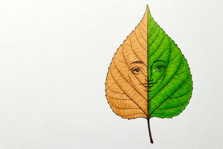 A financial report lies open under the warm glow of sunlight, its stark numbers juxtaposed with the vibrant hues of autumn Two auburn leaves, their edges crisped by the season, rest alongside a single, vibrant green leaf, symbolizing the cyclical nature of business and the convergence of nature and finance AI Generative