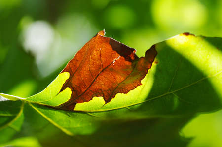 This close-up photograph showcases a damaged green oak leaf detailing natural decay patterns, set against a softly blurred background to highlight its unique textures.