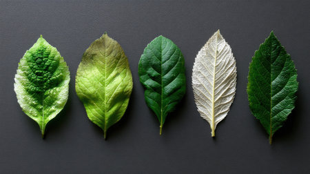 Five different types of leaves, each with a unique color and texture. The leaves are arranged in a row, with the first leaf being green and the last leaf being white