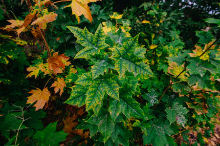 leaves changing colors in autumn, red, orange, yellow colors and details
