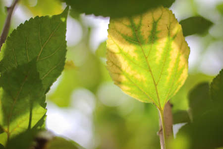 tree green leaf backlit by the sun on a blurred background, filter effect
