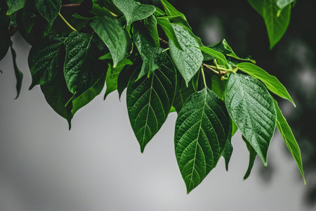 Rich green leaves are displayed in a close-up view, highlighting their smooth texture and vibrant colors under soft lighting, creating an inviting and serene atmosphere.