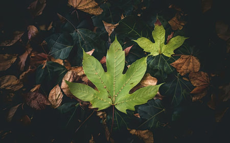 Fresh green leaf on a pile of autumn leaves, symbolizing renewal