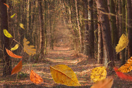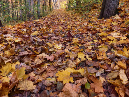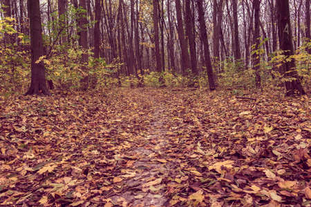 Autumn forest with a path through the fallen leaves. Nature background