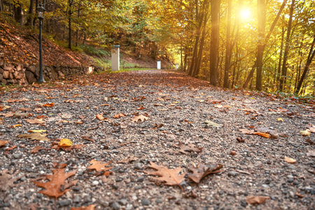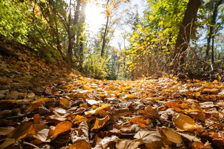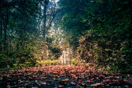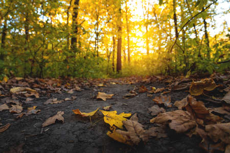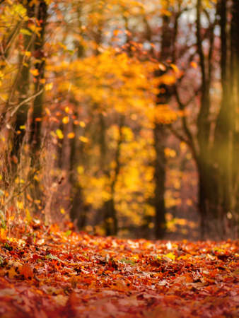 Sun rays break through the trees and illuminate the path covered with fallen leaves in the autumn forest. Selective focus