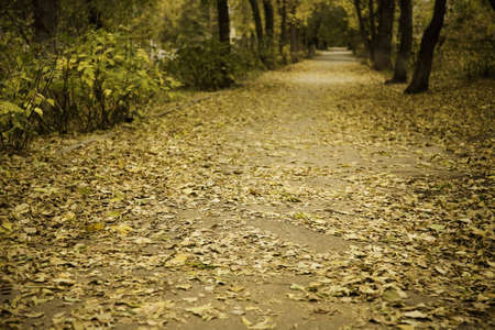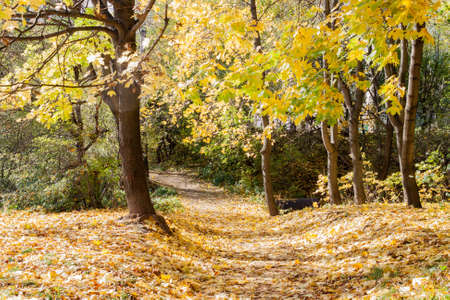 Autumn alley in the park with fallen leaves. Beautiful autumn landscape.