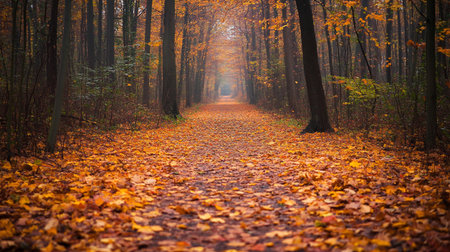 A serene forest path of autumn leaves invites reflection on a misty morning.
