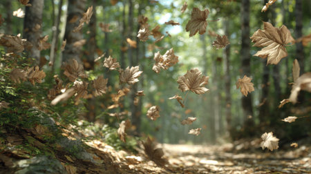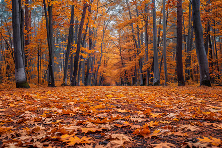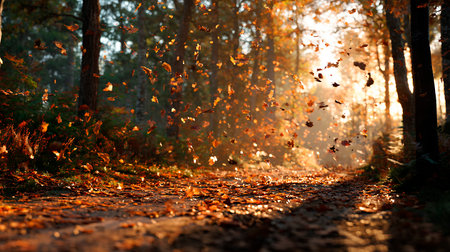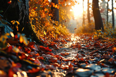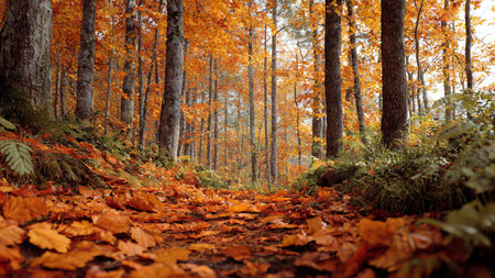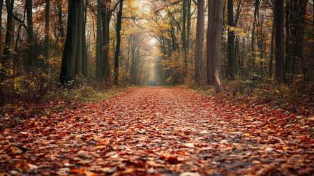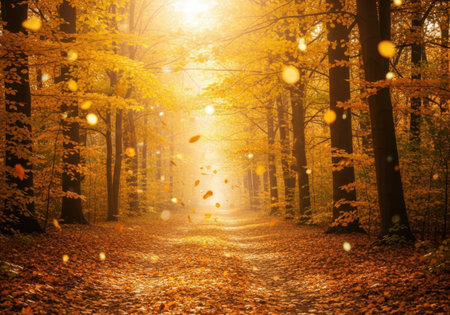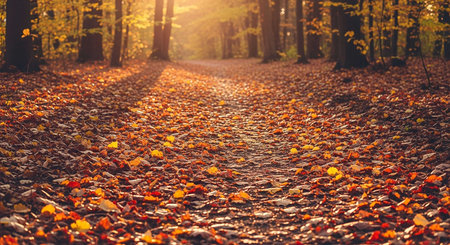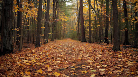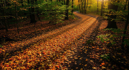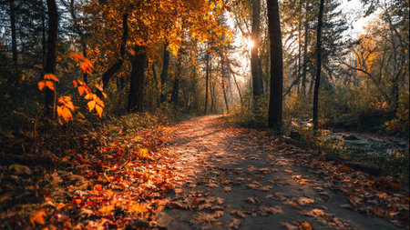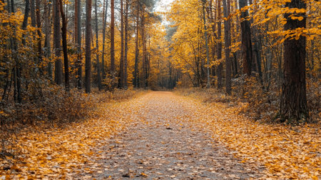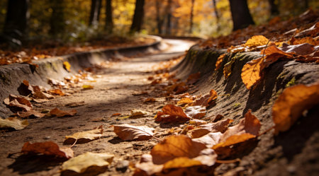 A serene path winds through an autumn forest, blanketed with amber leaves, surrounded by tall trees, and illuminated by the late afternoon sun casting a golden glow over the landscape. AI generated image