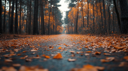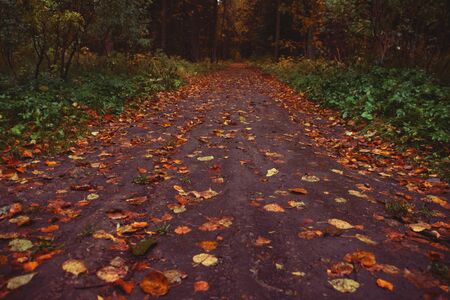 Autumn forest road with fallen leaves in the fall. Beautiful autumn landscape