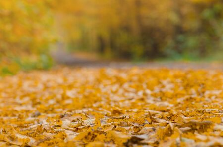 Colorful texture of autumn leaf. Fallen forest leaves on ground. Autumn leaves everywhere on the ground.