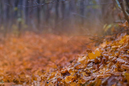 Fallen leaves on the ground in a foggy autumn forest.
