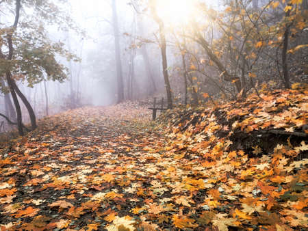 Path in the forest. Beautiful autumn landscape with foggy forest.