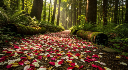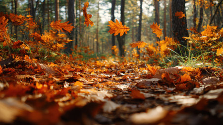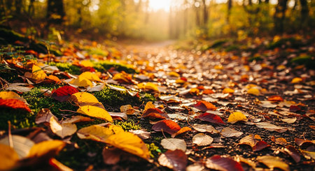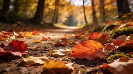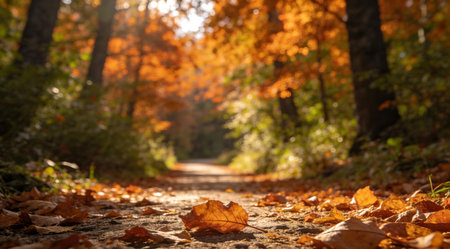 A serene forest path, adorned with vibrant autumn leaves in fiery red and golden yellow, invites exploration beneath warm sunlight, showcasing the beauty of nature and changing seasons