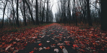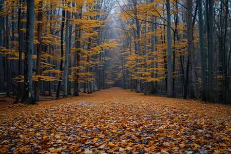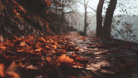 Fallen leaves on a forest path, misty autumn day.