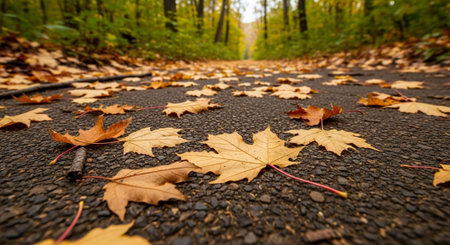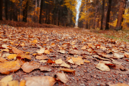Autumnal road in the forest with colorful leaves on the ground