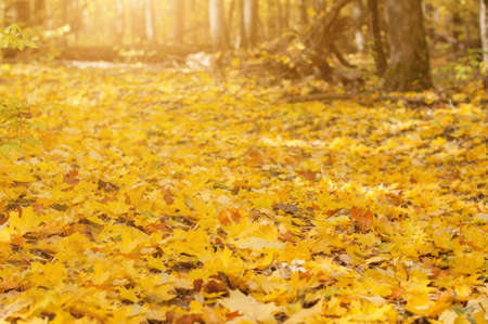 Golden maple autumn leaves on the ground the wild forest. Fall background.