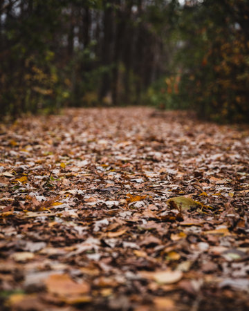 Forest path strewn with autumn leaves. The play of sharpness and blur. In the background are green trees.