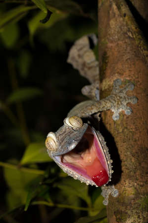 Giant Leaf-tail Gecko, Uroplatus fimbriatus, Nosy Mangabe park reserve, Madagascar. Gecko with opened mouth showing his red tongue as defense against the enemy. Madagascar wildlife and wilderness