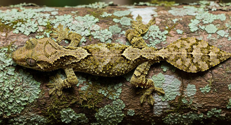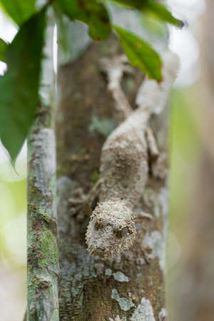 Mossy leaf-tailed gecko (Uroplatus sikorae) camouflaged on a tree in Madagascar