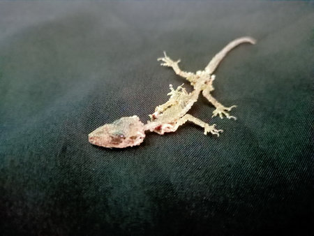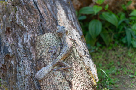 A Halmahera giant gecko who is sunbathing on its head is attacked by a small snail. This endemic reptile from Halmahera Island, Indonesia has the scientific name Gehyra marginata.